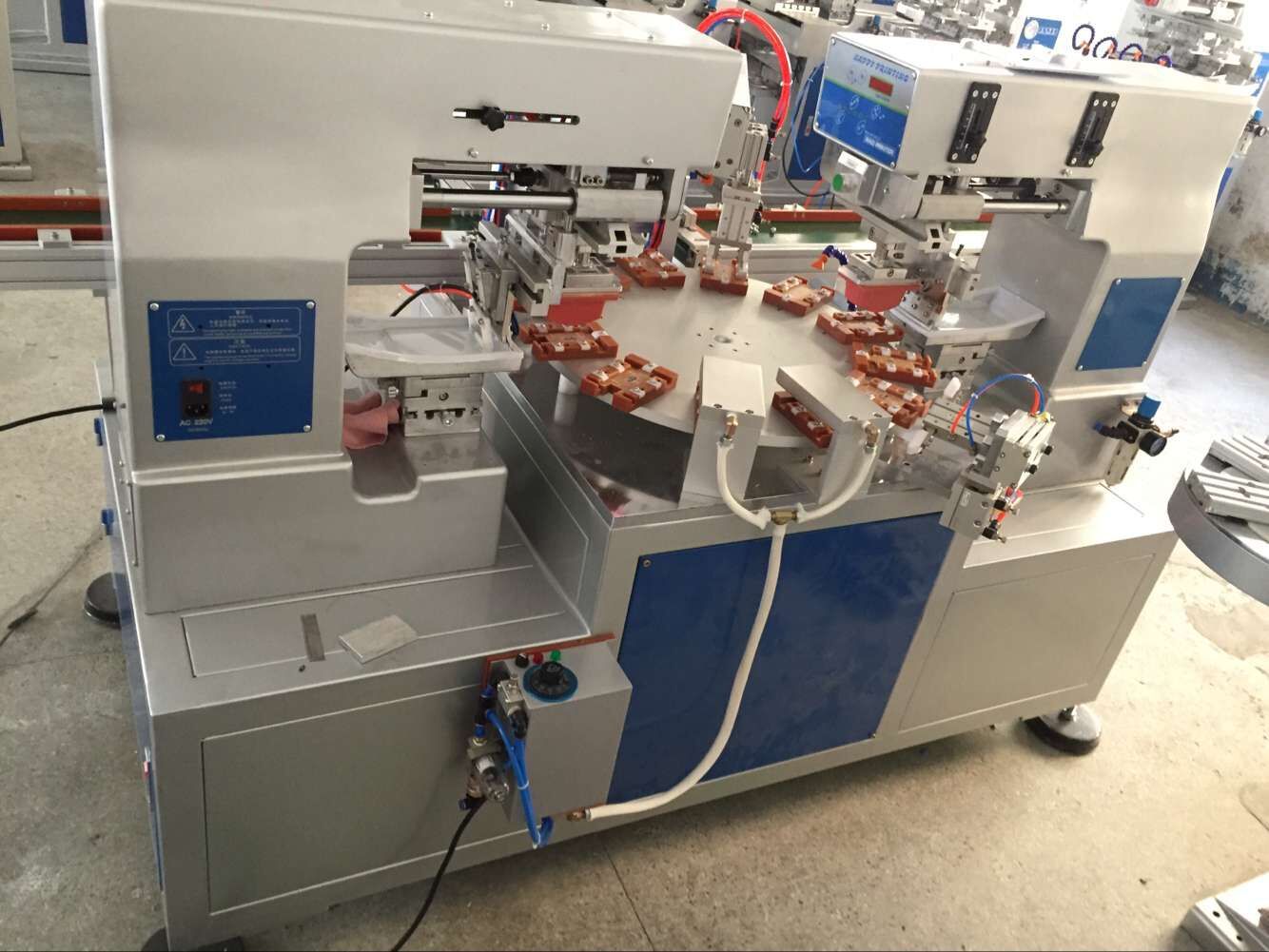 1、 印刷速度比轉(zhuǎn)盤機(jī)慢,但印刷工件可以大一些,四個顏色一次套色印刷完成。